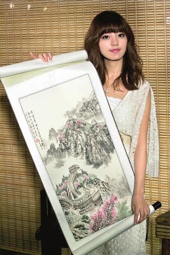 昨天,歌手阿兰在北京展示吴宇森赠送给她的水墨画《长城春色》。阿兰还透露,《赤壁(下)》的主题曲为《大江东去》,由日本作曲家岩代太郎操刀。吴宇森夸阿兰唱出了电影的豪情。记者张伟 易东方 摄
