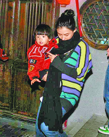 体态飘孕味的张柏芝前晚抱儿子Lucas小心翼翼下楼梯。