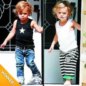 虽然汤姆·克鲁斯爱女苏瑞不得了,经常占据娱乐头条,但网民认为大美女格温·斯蒂芬妮两岁的儿子金斯顿·罗沙戴尔最具时尚味道,他的这身黑白牛仔配穿出了加州轮滑少年的潮流感觉。