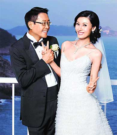 李嘉欣与许晋亨的婚纱照,摆出俏皮姿势。