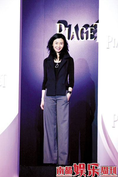 张曼玉以形象大使的身份出席某珠宝品牌活动,黑色修身上衣搭配烟灰色宽松长裤子, 简洁却富设计感,搭配伯爵的新款珠宝,明丽动人。