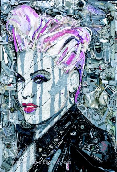 这张作品很好认,从竖着的利落短发就可以看出是Pink,头发无非是牙刷、打火机、棉棒、唇彩等,最好玩的是背景,走“怀旧复古”路线,废旧手表、卡带、寻呼机,计算器等都被拿来做陪衬。