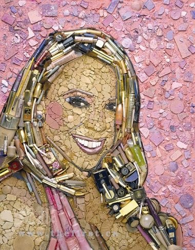 一看就知这是花蝴蝶玛利亚·凯莉,这张作品的原料也最有意思,用过的腮红、眼影打底,皮肤是粉饼块,头发是各种睫毛膏、眼影刷、唇膏、眼线笔等化妆品,而泡在化妆品堆里的“花蝴蝶”还真别有一番气质。