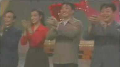 刘晓庆身着红色连身裙,乌黑的披肩发,凸显出年轻、朝气。而男主持人大多身着中山装,还有卡其布的工装,偶尔也会见到西装,但不打领带。