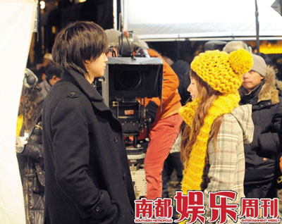 何润东:跟她一起拍戏还蛮开心的,因为她真的是一个非常友善、非常棒的女孩子。吻戏的事情是这样的,那天我朋友来探班,他带了一些北京烤鸭来给我吃,我就一时忘记晚上我跟章子怡还要演吻戏,结果就吃了很多,然后蘸了很多葱??后来想起,才发觉我怎么变成了一个最没有演员道德的演员?那时满嘴都臭得要命,现场的灯光师都闻到葱的味道,更何况章子怡跟我要接吻呢。所以我也觉得特别不好意思,就找了一些味道很冲的鱼干给她吃,这样子我们两个算是没有谁对不起谁了。不过最苦的是旁边工作人员,他们又要被鱼干熏,又要被葱熏,大家看这场戏以为是很浪漫唯美,其实它的背后是味道很难闻的。