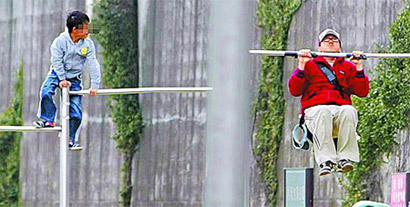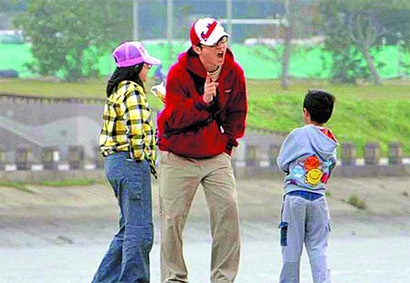 伊哈一家三口年初三到北海道团聚,之后悄悄返台,据说这次碰面是解决家务事,昨下午记者目击哈林带哈利到大佳河滨公园,好动的哈利一下车就直冲单杠,挂在杠子上荡来荡去,身手矫捷。哈林不时比手画脚指导哈利如何使力,还童心未泯走到较高的单杠前大手一拉,吃力地拉了3下。随后哈林抱起哈利教他爬树,父子亲近大自然玩得忘我。