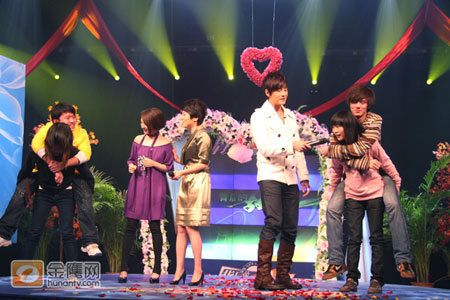 完美的“新娘抱”过后,粉丝的热情只增无减,演播厅的大屏幕又很是适宜的播放郑元畅、林依晨主演的偶像剧《我的爱情面包》中,郑元畅横抱林依晨参加耐力比拼游戏的片段。主持人张丹丹提议现场派出四名粉丝(两男、两女)上台来玩“耐力大比拼”的游戏。搞怪的郑元畅更是提议游戏中,由女生背男生进行游戏,增加比赛难度。