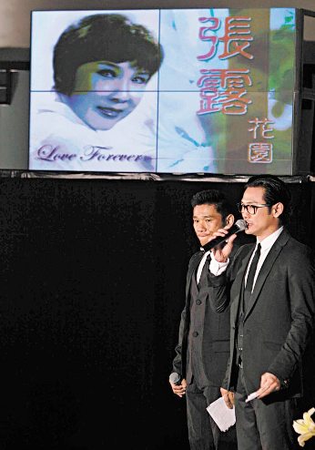 张露生前的乐坛好友前辈姚莉、刘韵、静婷和潘迪华,昨日一早抵达追思会,而杜德伟好友梁朝伟,昨日一身黑衣出席完下午海洋公园活动后,先与锺镇涛和陈国熹到尖沙嘴半岛酒店把酒谈心,然后再一起出席追思会。虽然伟仔未有接受访问,但他专程赶入屯门慰问老友,可谓相当有心。