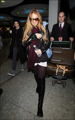 林赛·罗韩果然是帅气难挡,黑色皮夹克配紫色袜子,最重要的是紫红色围巾,配饰很重要,配上林赛脸上带着的超酷墨镜颜色镜片,LV大包体现品味。实在是太棒了,林赛果然是街拍女王。