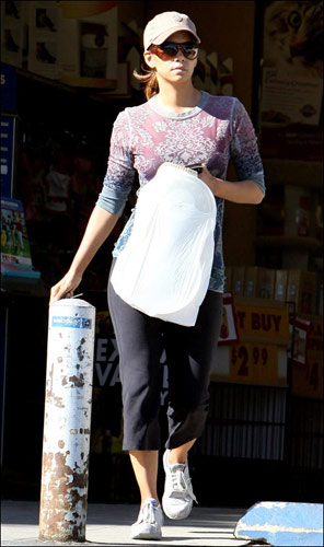奥斯卡影后哈莉·贝瑞最近一身休闲运动装扮亮相街头,头带蓝色棒球帽,配黑色大墨镜,明星范不减,加上印花七分袖上衣,蓝色七分裤,健康性感。看来我们也需要多多运动哦。