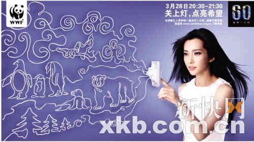 内地女星李冰冰近两年除了成为国际一线品牌青睐的对象外,由于其形象健康,也受到环保组织的注意。日前,由世界自然基金会(简称wwf)发起的 “EarthHour”活动,就看中了李冰冰的国际号召力,将她从《风声》的剧组里“借”了出来,于3月28日在北京鸟巢发起“熄灯一小时”活动。该活动一向具有广泛的国际影响力,在澳大利亚更请到了好莱坞巨星妮可·基德曼担任推广大使。据悉在活动当晚,妮可·基德曼和李冰冰将分别出现在悉尼歌剧院和鸟巢中,并有机会用远程通话的方式响应此次活动。