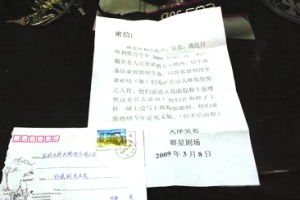 本报讯 (记者杨林)3月13日晚,“德云相声联盟”签约湖北武汉的天乐曲艺社前,郭德纲在后台向在场的媒体展示了一封恐吓信。写信人以德云社粉丝的名义,透露相声圈内有人出资20万元雇凶,将在今年年底前“结果”其性命。郭德纲称,自己过去收到多封类似的“恐吓信”,但一直把它当做笑话,称20万还没自己的出场费高。