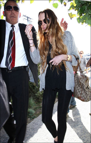 当天林赛带上了自己最爱的几乎能遮住整个脸的黑超墨镜,外套是现在最流行的白色网眼外套,金棕色的头发长长的搭在肩上,我们的街拍女王好像又要回来了。但是林赛好像不喜欢狗仔跟拍,一直是低着头或者用手捂住自己的脸。