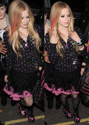 3月18日,艾薇儿和好友去夜店玩,身穿黑色底色外套,上面有这神秘藕合色骷髅头的连帽外衣,下面配了粉色的蕾丝小裙子,黑色的花纹丝袜,配上艾薇儿金色头发,枚红色的挑染,实在是太好看了,甜美中有这摇滚的个性,让你想说不喜欢都难。