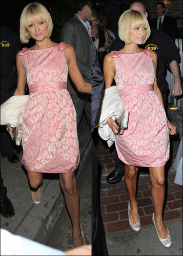 帕丽斯·希尔顿每次出现都绝对是我们瞩目的焦点,聚光灯下的绝对宠儿。3月24日晚上帕丽斯·希尔顿和男友外出吃饭,当天的帕丽斯·希尔顿身穿粉嫩的连身裙配上自己金黄色蘑菇头,浓密的睫毛排在眼睛上,十分的甜美诱人。银色BLING BING高跟鞋配银色手包。