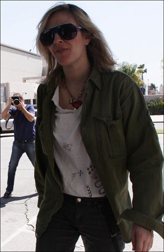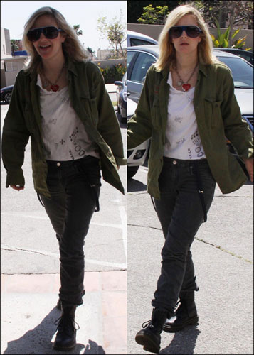 3月24日,打扮越来越有自己风格的德鲁·巴里摩尔来到美国加州好莱坞的一个工作室,身穿军绿色上衣、黑色长裤配军装靴的她显得帅气而随性。