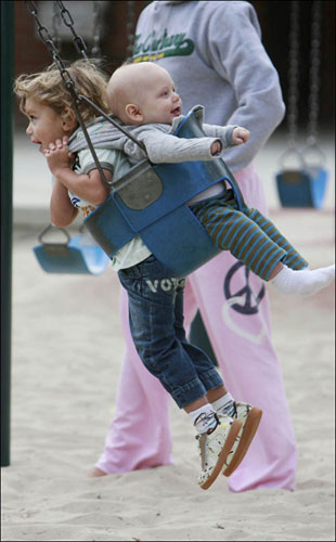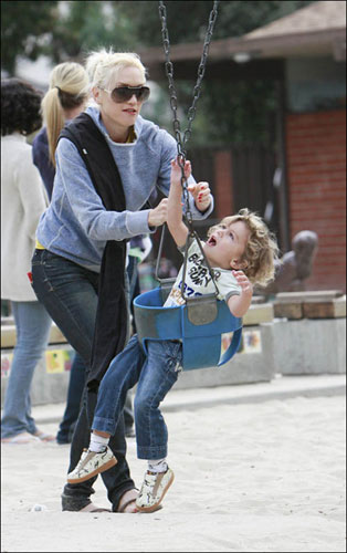 周日(3月29日)格温·史蒂芬尼和她的丈夫盖文·罗斯戴尔带着他们的两个儿子——2岁的金斯顿和7个月大的祖玛在比弗利山庄公园度过了快乐的下午。可能是要从小培养两位小帅哥的平衡能力,长大了做“超人”,格温·史蒂芬尼变身大力妈,用尽了全身的力气旋转两个BB做的秋千,两个小家伙则是拼命的抓住秋千,金斯顿露出了晕眩的表情,小祖玛则是一脸的茫然。看来飞行员要从小培养。