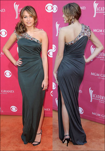 麦莉·赛勒斯。又现斜肩设计,小麦莉最近的穿衣风格逐渐成熟,也越来越适合红毯了。整个裙子及地显得腿长纤瘦,斜肩上的大宝石贵气十足,配上小麦莉甜美笑容,赞一个。