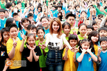 小朋友见到偶像到来,非常兴奋,就连家长和老师也不分老小忙着拿起相机拍照,全校为之疯狂,让蔡依林在活动结束后,差点离不开校园。