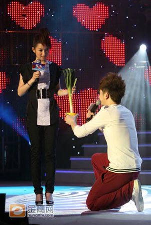 这位当红的人气偶像不仅迷倒了在场的观众,连“海豚王子”王栎鑫都拜倒在林依晨的裙下,现场更是搞笑上演抱葱求婚一幕。林依晨献唱了《你》后,在特别环节中接受了演技大考验,主持人即兴要求林依晨表演“求婚”的桥段。这时,一旁的王栎鑫按耐不住,自告奋勇上台“求婚”。调皮的王栎鑫手捧一颗大葱,单腿跪下对林依晨深情告白:“亲爱的晨晨,我知道你喜欢直树,所以我送你一颗葱。虽然我没有你家直树帅,但我会每天为你唱情,对你好,嫁给我好吗?”惹得现场观众大笑不已,一边的男主持人大左更是醋意大发,直言喜欢林依晨很久,也要向她求婚,不过大左的求婚礼物是非常具有长沙特色的臭豆腐。面对一大盘黑乎乎的臭豆腐,林依晨似乎被其独特的气味吓到,捂着鼻子直呼“我还是选择葱吧!”场面十分搞笑,晚会气氛也达到了高潮。