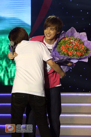 此次重回“福地”的王栎鑫,与现场歌迷大玩游戏,不但与观众互动演绎了一出《刘海砍樵》,更与歌迷亲密合唱了一首《天生一对》,颇为搞怪的舞姿、多变的表情令现场气氛更为火爆。和李易峰一样,王栎鑫也遭遇了热情粉丝的大熊抱。
