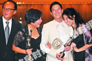 张家辉随后在接受著名主持人查小欣的访问时表示,以后不会再带着妻子参与夺奖,不过仍很甜蜜地说,“其实颁奖前她比我还紧张,宣布时,她使劲握着我的手,险些把我的手都握断了,得知获奖后我就和她来了一个长长的拥抱。”