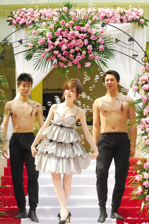 从加长“悍马”下来后,大家才发现眼前的王心凌跟过去的学生妹形象有了很大改观,因为她一袭露胸裙装,还常常低首,露出春光无限,现场的港台记者摄像机更是拍个不停。特别值得一提的是,引领这位“甜蜜教主” 登上布满粉红玫瑰花瓣红毯的,是两个裸露上身的男舞者,而记者们喝的茶是特制的桃花茶,整个发布会,可谓是“桃色”意味浓厚。