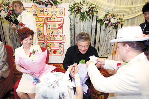 博比·肯接受采访时,以一口流利的中文对记者表示,赵本山就像他的父亲,“让我俩赶紧把婚礼办了就是他首先提出来的,今天这个日子也是他定的”。赵本山则透露了这对新人从相识、相知到相恋的经过:“1999年,小伙子(博比·肯)去香港演出,婷婷(张雯婷)当时是跳舞的,也不知道他俩怎么就认识了,还整出来一个什么‘二人组合’。”博比·肯追求艺术的那股劲头感染了张雯婷,她爱上了这个“一根筋”的同行老外,“后来呢,婷婷去北京电影学院学导演,毕业后两人又长年在外头演出和拍戏,婚事就这么着给耽搁了”。直到今年他们相恋10年之际,博比·肯才得以正式迎娶张雯婷。对这位爱徒,赵本山赞赏有加:“小伙子挺机灵,进步很快。我2002年教他二人转,现在他登台表演,你已经感觉不出来他是老外了。”博比·肯还曾在《刘老根》等赵本山的多部电视剧中出演角色,而张雯婷还担任了《刘老根2》的执行导演。本报记者 晨晓 文/图
