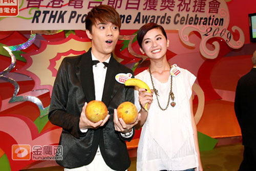 蔡卓妍(阿Sa)、张敬轩6日为港台获奖祝捷会担任颁奖嘉宾,会上公布0八至0九年度获得的七十七个国际及本地电视奖项。活动后,阿Sa与轩仔影合照,轩仔拿着两个大木瓜递给阿Sa,并笑说:“以形补形。”