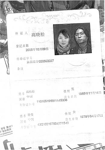 昨晚(6日),网上惊现著名音乐人高晓松的结婚证照片,上面的资料显示身为新郎的高晓松和新娘符莹(歌手阿朵的本名)于2005年10月9日登记结婚,生于1969年的高晓松和新娘两人年龄相差10岁。记者试图向两位当事人求证,但两人均未开手机。