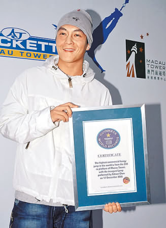 中新网12月18日电 陈冠希昨在澳门旅游塔进行高空弹跳,从两百三十三公尺(约七十层楼高)的高空一跃而下,成功缔造“世界最高商业高空弹跳”的世界纪录,获一百万元港币的代言费用及创纪录奖状。