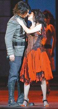 中新网12月24日电 23日晚在台北小巨蛋暮色的背景,半空垂降下来的高台上,火红舞衣的张惠妹独舞,舞出“卡门”的爱恨情仇,也舞出她投注10个月的心血,直到她高亢唱出的“爱情~~~不过是一种普通的玩意儿”,观众爆出掌声,证明“卡门”并未卡住天后的事业。歌迷关切阿妹与阿杜的舞台亲吻,最后以“借位”处理。