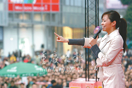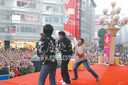 中新网1月8日电 重庆晚报消息,昨日下午,张靓颖、羽·泉、小柯、黄雅莉、江一燕等一干明星齐齐亮相解放碑中心舞台,参加“念慈菴·中国歌曲排行榜重庆歌友会”拉票活动。上万热情的粉丝把解放碑广场围了个水泄不通。羽·泉在台上演唱时,一男子跑到台上给他们两人一人一个熊抱,弄得他们面色尴尬;而张靓颖在台上也遭一大妈级“凉粉”抚摸,惹得台下“凉粉”们醋意大发。