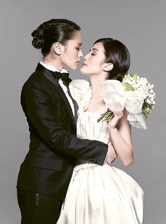 | 中新网2月2日电 香港明报消息,Twins推出纪念精选集《我们相爱六年》,两人时男时女穿着婚纱与礼服拍摄了一辑结婚照片;两人近距离嘴对嘴,十分亲热。有关照片曝光赢得称赞有美感外,但网民亦就照片的大胆意识作讨论;有指她们在宣扬同性爱为题,短时间已有逾千五次的浏览,亦有不少网民响应。有指她们是不少小朋友的偶像,这种亲热照片曝光会否带来坏影响,意识不良,有较偏激的更提议向广管局投诉。不过,亦有网民为Twins抱不平,赞照片有美感,认为有人滥用投诉。记者就事件向广管局查询,现今未接获任何投诉。