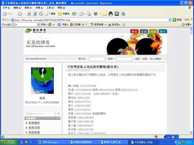 “瓦花的博客”在3月2日10点9分的帖子上,赫然列着“千位明星私人电话再次爆现”,博客的主人在这之后列出了长长的电话名单,在名单之前,他(她)还补充了一句,“网上再次曝出近千明星私人电话,众受害艺人纷纷谴责这种揭露隐私的行为”。然而记者搜索了网络,却只在这个博客上看见了这个电话名单,其他地方没有找到同类的电话名单。记者此后又核实了这个电话名单,发现,该电话名单虽然没号称的“千位”那么多,但真实性非常高,和记者私人电话本上的很多电话都是吻合的。在这个电话名单里,羽·泉、陈宝国、袁泉、赵宝刚、赵本山、张国立、敬一丹、从维熙等演员、歌手、导演、作家、主持人等各类人都有,甚至连中央电视台台长赵化勇的电话也在其中。不过,已经去世的傅彪的名字也被列上了。
