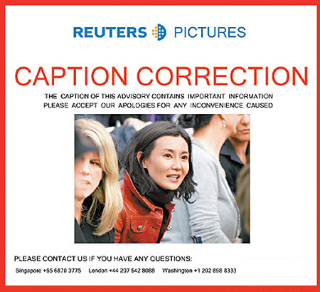 报道说,张曼玉前两周前才被美国《纽约时报》选为去年“伟大的表演者”,结果路透昨日发出她看秀的照片,竟然把她的英文名字Maggie Cheung误写为巩俐(Gong Li),3分钟后路透发现错误,紧急发出道歉更正启示还她清白。