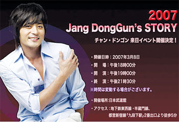 韩国天王明星张东健将于3月8日下午7点,在日本东京武道馆举行和8000名海外粉丝的见面会,这场见面会同时也是他的生日会,该会被命名为“2007JANG DONGGUN''STOTY”。