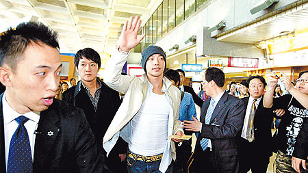 他昨午离台,300多名送机粉丝再度挤爆桃园机场,他不时微笑并挥手向粉丝道别,歌迷忍不住又哭了。