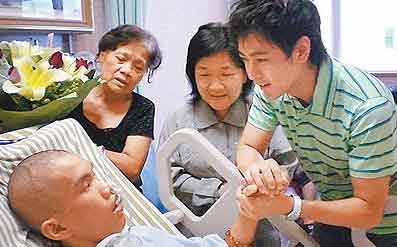小志前天在外地获知此消息,昨特地返台南下高雄长庚医院探视这位粉丝,还带DVD、原声带给他力量,他并紧握周昱亭的手说:“周弟弟你要好好加油,要赶快好起来。”他才哽咽说完,粉丝也跟着流泪。