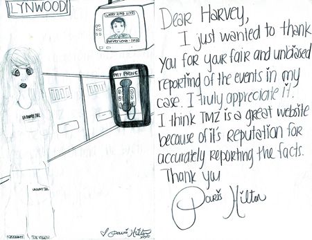帕里斯还公布了自己在入狱期间的一幅自画像,以表示对《TMZ》网站老板的感激之情,认为他在自己入狱期间给予自己公平公正的报道。