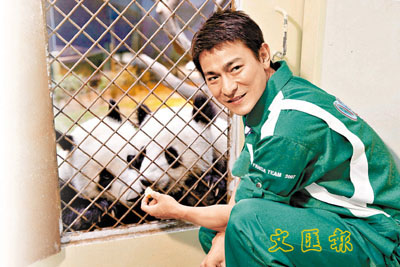 华仔称赞大熊猫真的好可爱,很听话又乖巧,能够亲身照顾盈盈、乐乐,华仔感到非常兴奋。为宣扬保育野生大熊猫,华仔更当场展示其构思的“Inspired by Andy Lau”限量版大熊猫慈善T恤,他更是脱下制服亲自展示自己设计的作品,据悉,善款将全部用作保育野生大熊猫之用。
