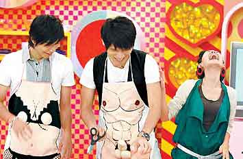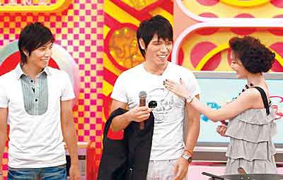 中新网7月6日电 台湾星光帮人气王杨宗纬、潘裕文日前上《大小爱吃》节目秀厨艺,喜欢肌肉男的小S,摸着潘裕文手臂大叫好软,还逼他用力;众人起哄杨宗纬脱衣,他竟拉起大S的手放在胸前︰“我可以用胸部跟大S打招呼!”抖动的胸肌让她害羞直尖叫。