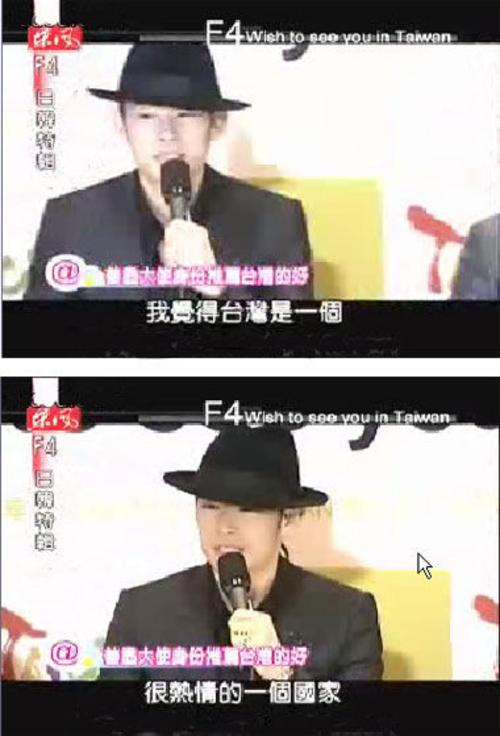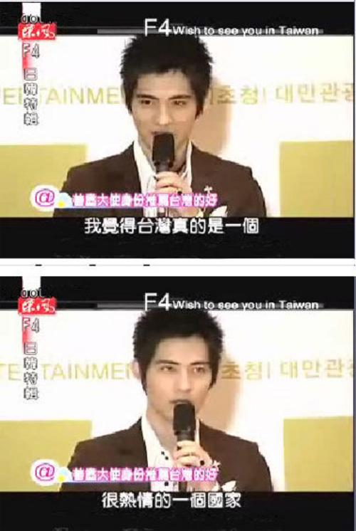 一位网友提供的是台湾某电视台播放的娱乐新闻片段,该段视频清晰地记录了F4在日本和韩国举办记者见面会的过程。F4成员言承旭讲道:“很开心,可以为我们国家尽一点能力,其实我觉得台湾是一个很有人情味的地方……”吴建豪和周渝民都说,“台湾是个很热情的国家……”