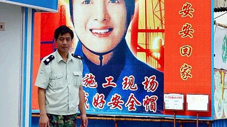 韩国明星裴勇俊的照片出现在上海某建筑工地的安全海报上,吸引路人的视线。该海报上写着“进入施工现场,必须戴好安全帽”。