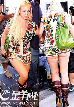 大多数面对抚养权官司和虐待儿童指控的名人都会夹起尾巴做人,以肃清公众形象——但这对布兰妮并不适用。对于她来说,穿着一条露臀的“印花超短裙”上街,不过是件平常事而已。看起来她将一件上衣误认为是裙子了,而这件衣服并未能遮住她凹痕点点的臀部。
