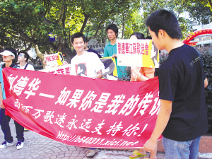 “外面这么晒,为什么不到大厅等?”“在大厅华仔能看到我们吗?在这里至少我们可以看到华仔的窗口!”询问之下记者才明白:原来歌迷等在外面是为了让偶像看到自己在等候,“3701在外面看应该就是开着窗子的那间,我们的喊声华仔应该能听到的”。“如果他不出来呢?”“他下不下来都无所谓,他是天王巨星啊,如果能猜到他下不下来他就不是华仔了。我们只是想让他知道我们的心情,让他看到江苏有这么多歌迷支持他,我们这个版上有几万人呢,今天这30多人几乎都是请假来的,还有淮安等外地赶来的……”“如果见不到他的人这样做值得吗?”“只要为了华仔就值得,见不到人我们也理解尊重他,我们喜欢他就是喜欢他的与众不同!”而几乎所有歌迷都表示相对于刘德华的音乐电影,“我们更喜欢他的为人”。这30多名歌迷一直等到下午5点钟才陆续离开,尽管没有见到偶像,但没有人有一句抱怨,“他一定有他的理由”。