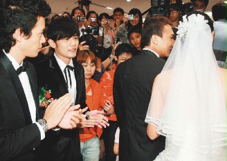 虽然昨晚天气不佳,但刘畊宏的婚礼仍是星光熠熠,包括吴宗宪、nono、胡瓜、温岚、许杰辉、柯有纶、许慧欣、方文山、康康与女友杨巧宁、Makiyo、夏如芝、K-ONE、黄志玮、马志翔、贾永婕夫妇等都赶来吃喜酒,吴宗宪因肚子不舒服,最后一刻才赶到现场,他笑说:“结婚是一天,也是一辈子,两位都是艺能界人士,但离婚率也很高。”逗得新郎刘畊宏哈哈大笑说:“我不怕!”宪哥也大方地包上12万新台币的红包作为贺礼。