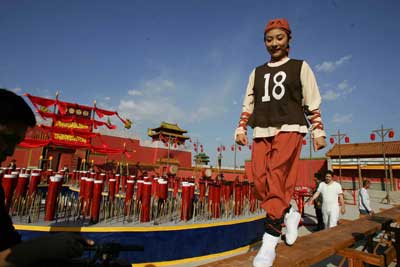 大型古装轻喜剧《壮士出征》已经进入拍摄尾声,昨天记者赶赴剧组探班,正赶上刘璇玩平衡木的好戏。不愧是体操世界冠军,拍摄现场半人多高的古代平衡木,刘璇一拧身子没怎么费劲就上去了。接着在上面又是小跳,又是摆优美POSE,在导演的撺掇下,还助跑两下来了个腾空大前跳,姿势完全是奥运冠军的范儿。