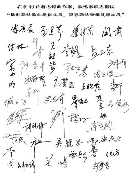 近年来,我国音乐事业出现了大繁荣、大发展的生动局面。这使得广大音乐工作者能够为满足人民群众日益增长的精神文化需求,做出了自己应有的贡献。随着互联网的快速发展,为优秀音乐作品的传播增加了新的途径,网络歌曲在群众中,尤其是青少年中的影响甚大,网络音乐呈现出产业化的发展趋势。然而近一段时间,有些网络歌曲格调低俗、歌词怪异,甚至以打情色擦边球等做法来哗众取宠,在客观上败坏了社会风气,毒害了青少年心灵,玷污了音乐艺术,这是令我们痛心和不愿意看到的情况。为了进一步加强行业自律,抵制网络歌曲恶俗之风,倡导网络音乐健康发展,树立音乐工作者良好的社会形象,特向音乐界同仁发出如下倡议: