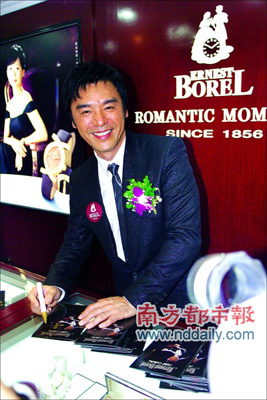 上周五钟镇涛到广州为某手表品牌在正佳广场开业做宣传。虽然已出道三十多年,但穿上笔挺的黑色西装,钟镇涛依然帅气十足。他透露最近准备亲自动笔写自传,书名暂定“阿B正传”,因为普通话听起来就像“阿B正赚”,是“好意头”。